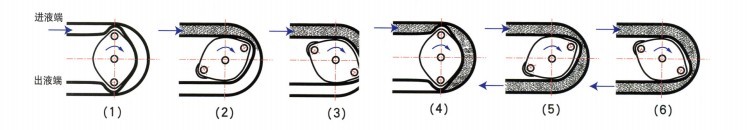 一、概述 FRU系列軟管泵是一種容積式泵,具有轉(zhuǎn)速低、效率高、無噪音等特點(diǎn),用途非常廣泛。其工作原理是:一對(duì)滾輪在充滿潤滑油的泵腔內(nèi)轉(zhuǎn)動(dòng),滾輪和泵殼腔壁一起擠壓著軟管,將軟管壓扁。隨著滾輪的轉(zhuǎn)動(dòng),軟管被壓扁的地方也逐漸從泵的進(jìn)液端向出液端移動(dòng)。在此過程中,進(jìn)液滿的軟管在自身彈性作用下逐漸恢復(fù)原狀,容積變大,從而產(chǎn)生真空將物料吸入,出液端的軟管逐漸被擠壓,容積變小,從而將物料強(qiáng)行排出,如此周而復(fù)始,物料就不斷被吸入和排出(如下圖),該泵的適用溫度為≤80℃。 二、工作原理
