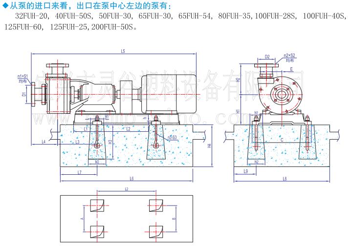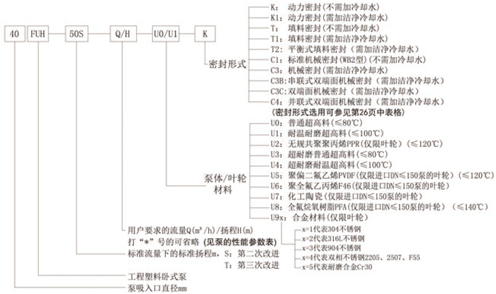一、概述 FUH系列工程塑料泵是原化工部引進(jìn)項(xiàng)目和"七五"國(guó)家重大科技成果,是在消化吸收引進(jìn)設(shè)備的基礎(chǔ)上,結(jié)合國(guó)內(nèi)耐腐蝕離心泵結(jié)構(gòu)的優(yōu)點(diǎn)精心設(shè)計(jì)而成,該系列泵1993年列入國(guó)家"火炬計(jì)劃"項(xiàng)目,獲1995年度新產(chǎn)品獎(jiǎng)。 二、用途 FUH系列泵主要應(yīng)用于各類(lèi)酸、堿、鹽、油類(lèi)、食品飲料、酒類(lèi)等液體。具體應(yīng)用于化工行業(yè)的各種硫酸、鹽酸、堿類(lèi)、油類(lèi)等清液或料漿崗位;有色冶煉行業(yè)特別是鉛、鋅、金、銀、銅、鈷、鎢、稀土等濕法冶煉中的各種酸液、礦漿、料漿(壓濾機(jī)配用)、電解液、污水等介質(zhì);化肥行業(yè)中稀酸(酸洗工藝用)、母液、氫氟酸、氟硅酸、海水及磷酸料漿等介質(zhì);水處理、環(huán)保行業(yè)中的各類(lèi)污水(食品污水、電鍍污水、皮革污水、制藥污水、造紙污水、紡織污水、電子污水等)及脫硫除塵;鋼鐵業(yè)酸洗系統(tǒng)的硫酸、鹽酸崗位;鈦白粉行業(yè)中的酸解、沉降、冷凍、水解、水洗、鹽處理;化纖行業(yè)的酸站;檸檬酸的發(fā)酵、中和、壓濾、廢水等崗位以及黑色金屬錳業(yè)等。此外,該系列泵不僅可以替代以上行業(yè)中的國(guó)內(nèi)同類(lèi)金屬與非金屬產(chǎn)品,也是進(jìn)口設(shè)備國(guó)產(chǎn)化的優(yōu)選產(chǎn)品。 三、型號(hào)說(shuō)明